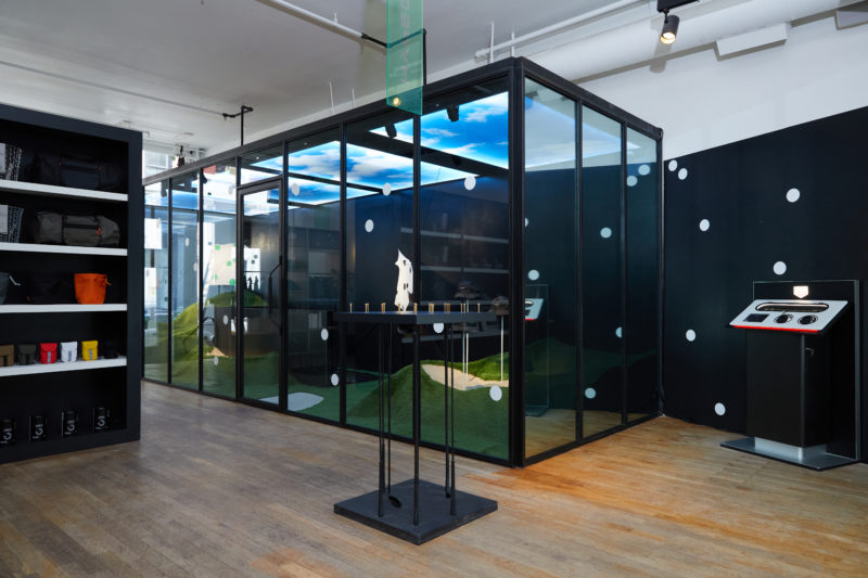 The pop-up is distinctively divided into three areas – a surreal landscape and apparel installation inside a minimalist glass box to encapsulate an infinite playing field, a contrasting perimeter of wood displays and natural-embracing furniture for a more casual social environment, and a golf simulator at the stretch of the store for an immersive golf experience.