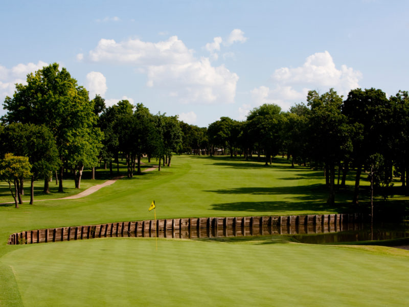 The 15th, a 472-yard par 4, is one of the most underrated holes on the course. The drive must be placed in the fairway to allow an approach to find its way through a chute of large oaks. It’s followed by the 538-yard 16th, where birdies are frequent. The green, however, is protected left by two huge bunkers and a creek, and the fast split-level green presents all sort of chipping challenges. This hole used to have a hangman’s noose in a tree to the left of the green, but both have now been removed and replaced by a different tree.