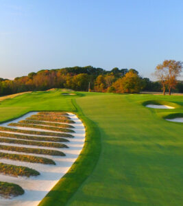 Bottom Line: Acres of tall, native-grass rough and terrifying greens perched atop bulkheads of rock are some of the features that mark this course as an example of Pete Dye’s all-or-nothing architecture style. It was designed to honor amateur golf and has hosted 18 amateur championships. There has never been a professional event of any kind held here.