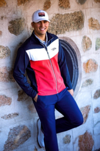 Completing the collection is the Asher Jacket, a versatile track-inspired layering essential featuring striking red, white, and blue piecing, designed to transition seamlessly from course to clubhouse.
