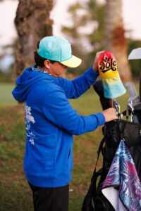 As far as accessories go, the customers can select from three hats. But don’t forget the golf bag itself. This collaboration features a new headcover for your clubs – decked out with an image of the signature DOLE Pineapple in a tropical ombre design. There is also a new golf towel available in a purple and blue tropical print.
