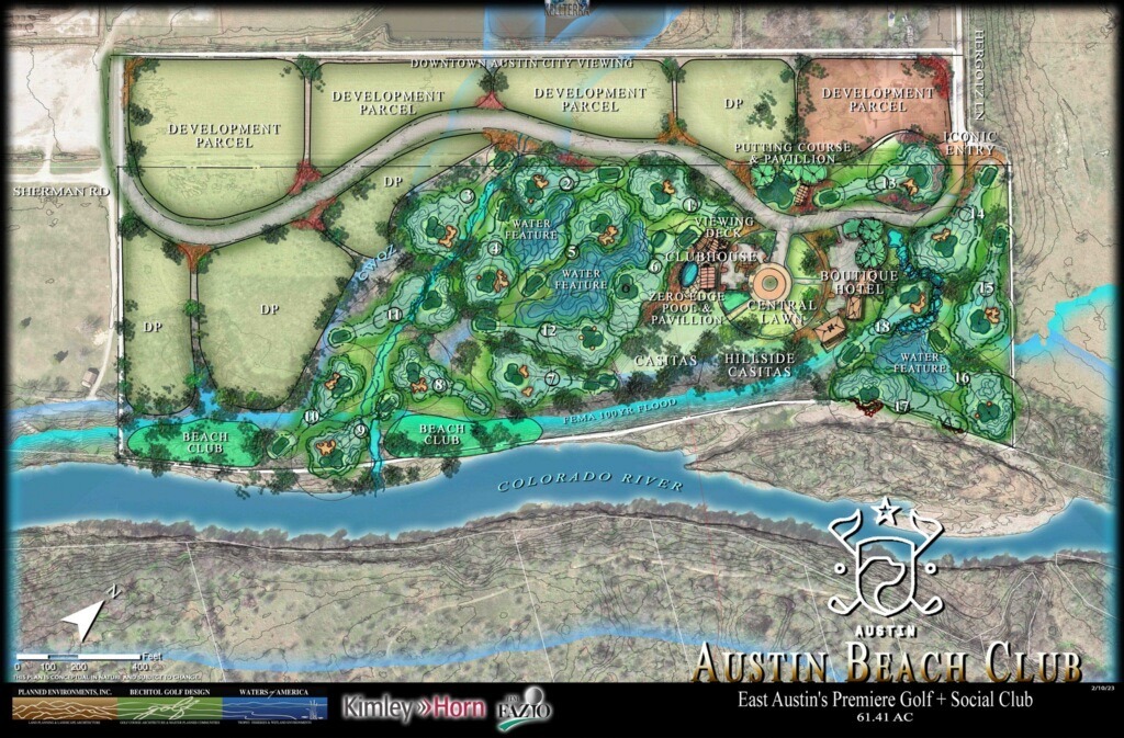 The new, members-only project is called Austin Beach Club and is in the final stages of planning and permitting, with ground set to be broken in September, pending city of Austin approval. The 63-acre site sits on the banks of the Colorado River just east of the Texas capitol’s burgeoning downtown sector and literally two miles from Austin-Bergstrom International Airport on a former mining hub that’s flush with sediment from the river.