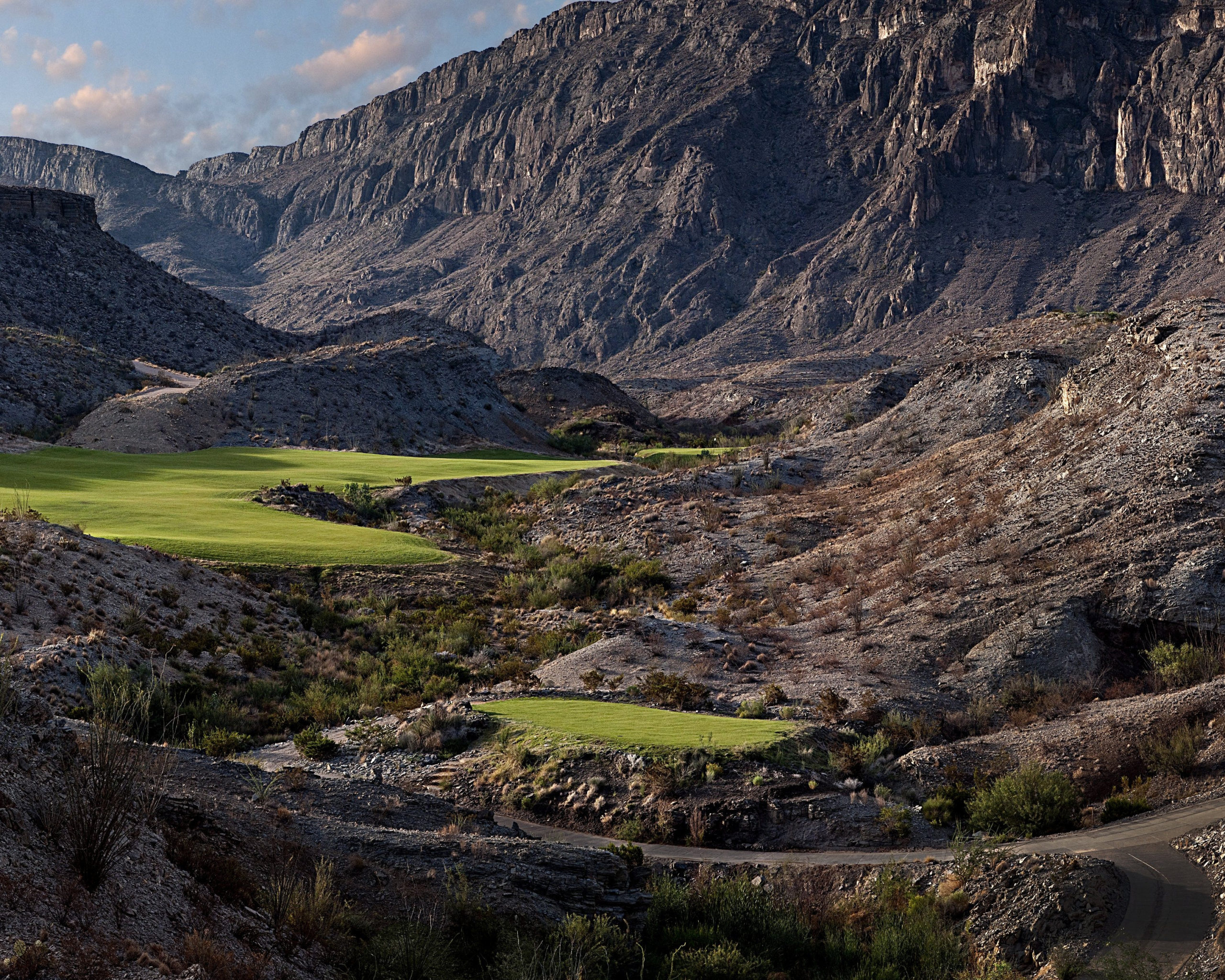 The Lajitas Resort is in the middle of the Big Bend National Park and is a definite oasis in an otherwise inhospitable region. The course, designed by Lanny Wadkins, has fairways lined with cottonwoods, palm trees, and grapevines ranging from wide open to narrow and contoured. The routing is over level river bottom land through the desert and foothills around water hazards and traps. It’s like playing golf on the moon.