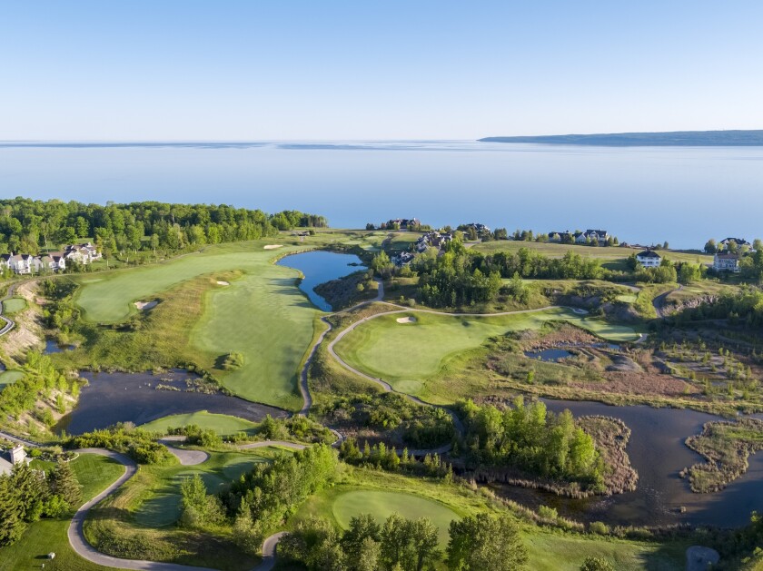 It features a unique combination of open links along the Lake Michigan bluffs, holes flowing in and out of a rock quarry, and through the area’s hardwoods. Nearby Crooked Tree Golf Club is carved through stands of centuries-old hardwoods perched on bluffs overlooking Little Traverse Bay.