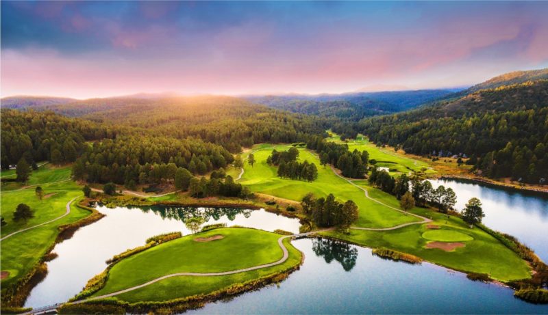 Set at about 7,200 feet and abutting the Mescalero Apaches’ sacred forest, this course offers a lot to think about. Golfers will find plenty of elevated tee shots and even an island fairway that sits in the middle of the Lake Mescalero, an ice-cold water body teeming with as many trout as wayward balls struck by golfers.
