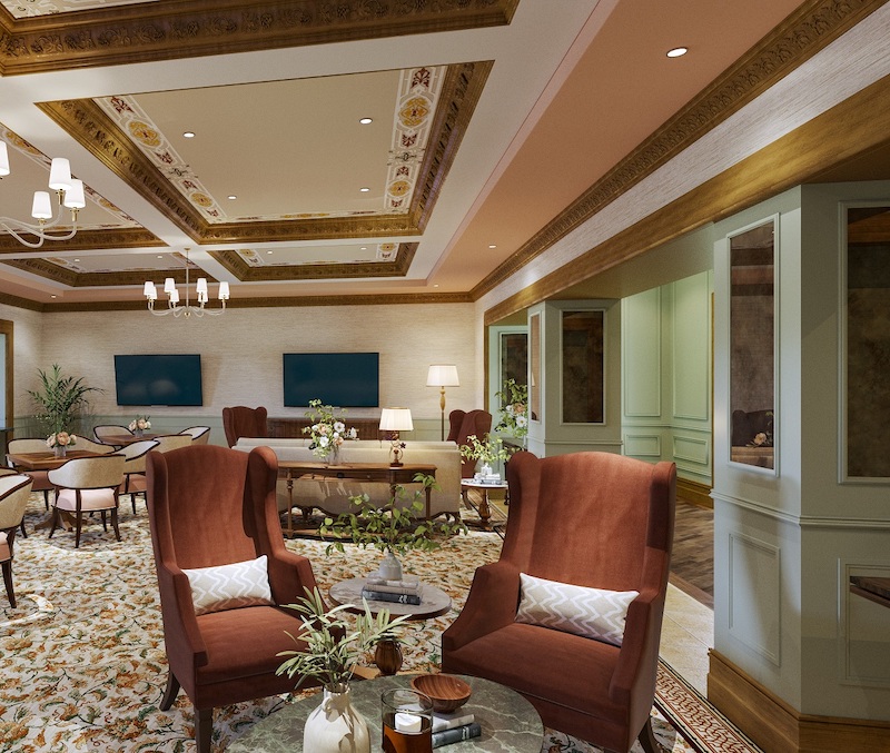 The Clubhouse refresh will include a variety of updates, from upholstered furniture in luxurious textures and warm colors, pendants and sconces with brass and Venetian glass, window and wall treatments with softer and lighter fabrics, and custom patterned carpeting.