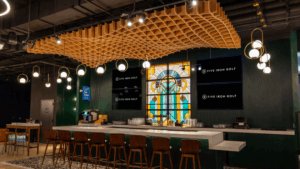 The design feels distinctly New York, shaped by a curated roster of leading artists, including Brooklyn-based Jason Naylor and DAIN, alongside New York graffiti artist SUCH and Blindfox, whose large-scale murals appear across Five Iron locations nationwide and have been recognized by The Boston Globe. Immersive murals, sculptural installations, and bold detailing create a multisensory environment across both floors that reflects the energy of Manhattan.