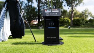 Full Swing KIT launch monitor data with the iconic stand display of FLAGD’s GPS unit