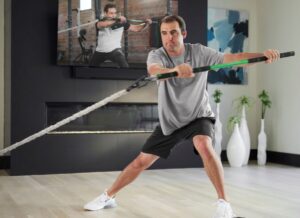 The GolfForever Swing Trainer, highlighted by its asymmetrical resistance training bar that can be anchored easily at home, the gym or the course, is a three-in-one training tool that additionally creates premium resistance bands with handles and a D3 swing weight-optimized heavy warmup club.