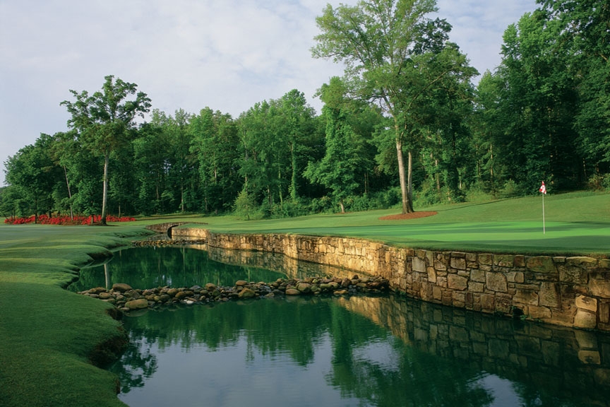 Great Waters is a dramatic layout that offers some of the most breathtaking golf scenery in the Southeast. The parkland-style front nine plays over rolling hills and through thick forest, with water in play on six holes, most notably the par-4 fifth, where a creek crisscrosses the fairway and cuts in front of the green; a stone wall and the Nicklaus Bridge add to the hole’s splendor. The gorgeous ninth is the first of the lake holes, the water edging in along the right side of the green.