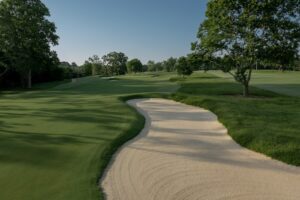 “The approach to the green is open from the right, with bunkers along the left. The green has a flatter, lower right side and a slightly higher, more undulating left side, adding complexity to the hole.”