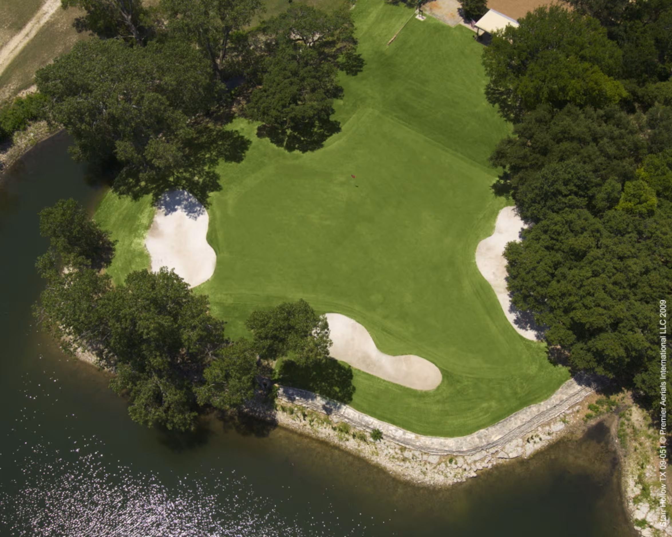 Blue Lake Golf Club is set on the south shore of Lake LBJ on a portion of the former Wennmohs Ranch. Finger designed the 2,376-yard, par 32 layout without a sand bunker and with a routing that includes five par 3s, three par 4s and one par 5. The first course record (which might still be the record, according to club management) is 55 for two turns around track as set in 1964 by 1959 Masters champion Jackie Burke. The course features rolling terrain – level lies are a premium – Bermuda greens, doglegs, lots of trees and views of the lake from several tees and fairways.