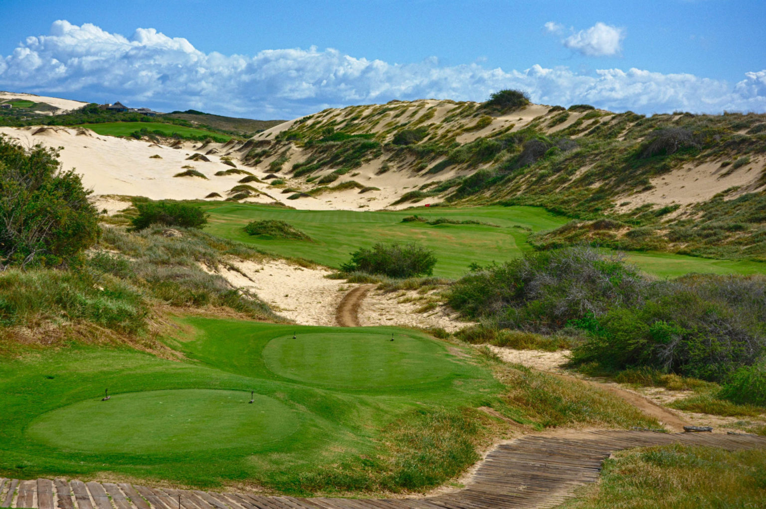 The prime amenity at a 1,400-acre master-planned community, Twin Dolphin (No. 15) occupies a superb location along the corridor linking the towns of Cabo San Lucas and San Jose del Cabo. Opened in 2018, the course, built by Fred Couples and Todd Eckenrode of Origins Golf Design, sprawls across a broad sloping plateau bisected by three major arroyos. Perched 180 meters above sea level, the layout, known for its fast-running fairways, dramatic rock outcrops and stark mountain backdrop, features a sweeping ocean view from every hole. Twin Dolphin is a private club accessible to guests of Montage Los Cabos, a resort hotel on Santa Maria Bay; and the Montage Residences.