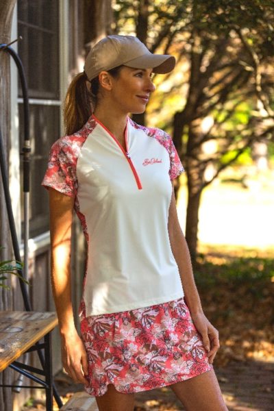 The Badlands collection combines the color palette of Passionfruit, Ivory, and Latte with patterns inspired by animal prints and hand-drawn florals. The Python Sleeveless Polo, with a subtle snake print, pairs nicely with the Supreme Skort, which has a back-flare panel and soft, stretchy fabrication with comfort in mind. The Aurora Polo has subtle styling on the front with a flourish print on the back and may easily be combined with the Remi Skort, providing a more daring appearance.