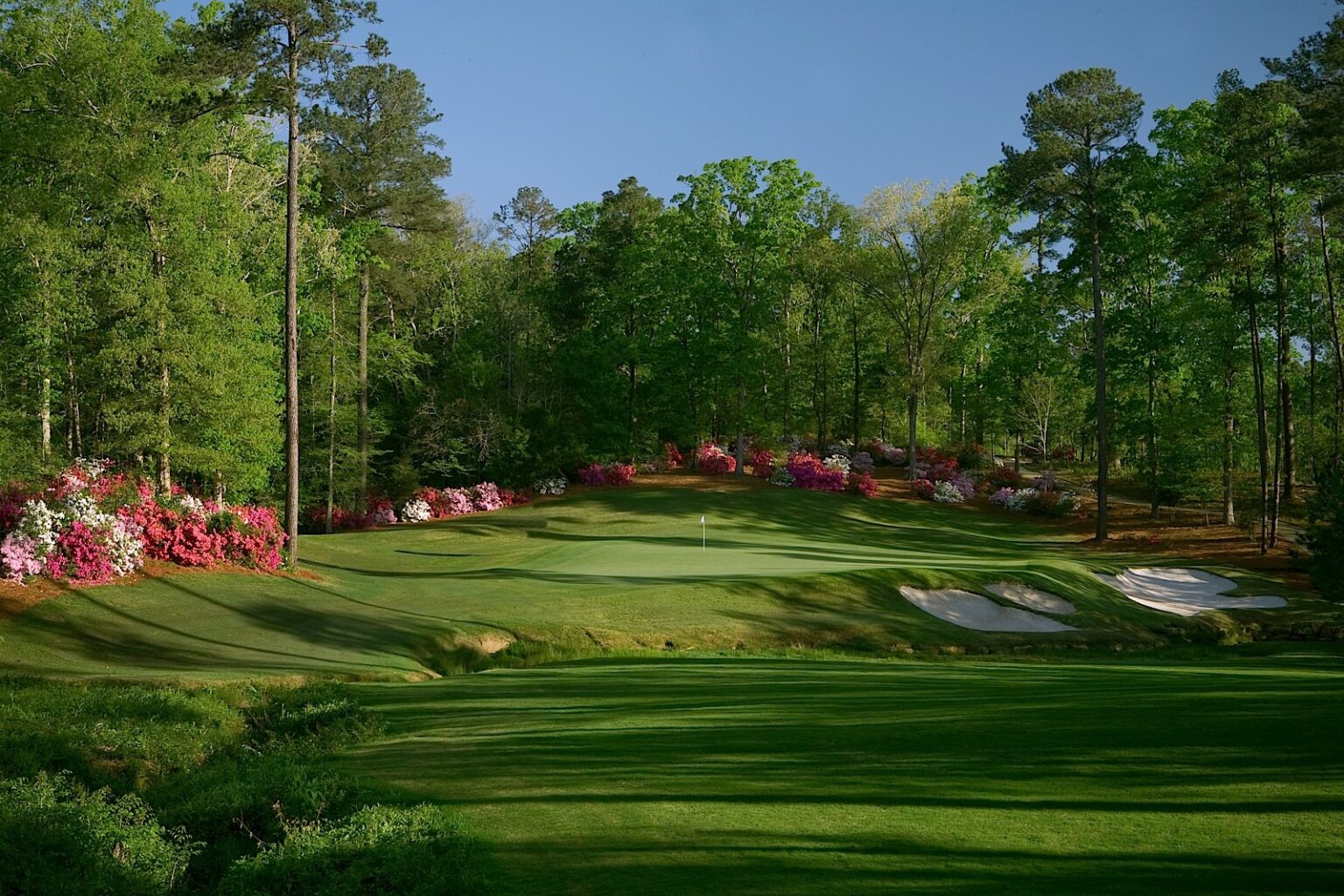 The finishing hole is a monster par-4 at 475 yards and requires a great uphill drive and an accurate second shot that dips down to a tough green protected left by trees and right by water. Blooming azaleas provide a backdrop to the hole and a buffer the course and an expansive clubhouse.