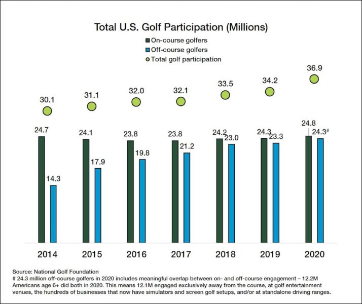 - When NGF began tracking off-course forms of golf some years back, it was to better quantify the game’s broader consumer base and footprint. This goes well beyond Topgolf – to other golf entertainment venues, and the hundreds of businesses that now have simulators and screen golf setups, plus the good old standalone driving ranges, which believe it or not still outnumber Costco warehouses. Today, almost as many people engage with off-course forms of golf as do traditional “green-grass,” with considerable overlap between the two. Over the past five years, the overall golf consumer pool has risen 19% to 36.9M – including now 12.1M Americans who only hit golf balls with golf clubs somewhere away from the course.