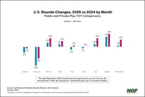 The latest rounds report, through September, revealed that private golf play was up more than 5% nationwide relative to September 2024. By comparison, public golf play was up about 1%. The trend was similar in August (+9% private vs +7% public) and July (+6% private vs +2% public).