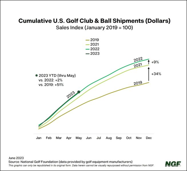 Entering June, golf club dollar shipments are down about 4% compared to the same mid-year stretch in 2022, while golf balls are up almost 18%.