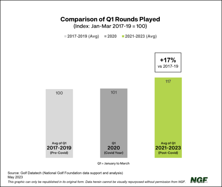 Comparing total January to March play for the past three years – post-Covid – rounds are up almost 17% compared to the three-year period ahead of the pandemic (2017-19).