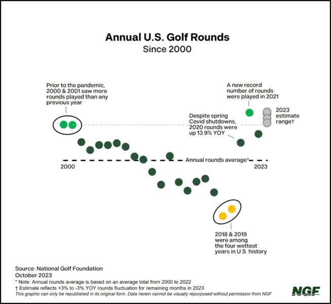 2023’s chances of being a record-setting year for play will boil down to… well, weather, rather than whether the appetite to play still exists. States like Arizona, California, Florida, and Texas count almost 3,400 courses and over 6.6 million golfers between them, a figure that doesn’t account for annual influx of snowbirds and traveling golfers from cold weather climates.
