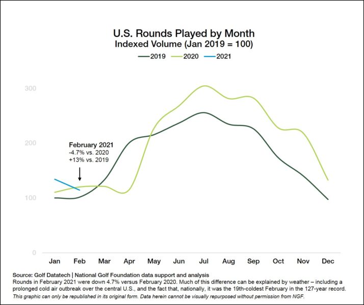 JUPITER, Florida (April 5, 2021) – The most recent monthly golf rounds numbers show something the industry hasn’t seen in a while – a decline in play. But there’s a bit more to unpack as we look back and look ahead.