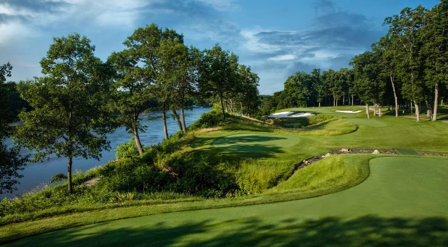 The 550-yard par-5 17th is a final chance at risk-reward with two bunkers on the left as the golfer approaches the green and a deep and undulating putting surface.