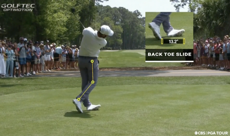 - How Scheffler’s right foot moves by more than 13 inches from setup to finish, and how he says the move is one of the ways he has stopped missing shots to the left
