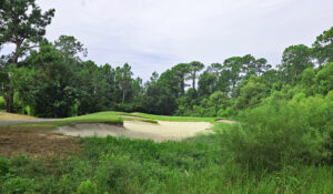 Trees line many holes, and where there are no trees, there’s usually sand or water. Water hazards and marshwetlands come into play on every hole, creating a layout that requires shot making and distance control rather than a ‘grip it and rip it’ approach. The greens are well-undulated and roll true; some of the best greens I’ve seen all year! As you might expect on a course with this much water, there are several forced carries off the tee and onto the green.