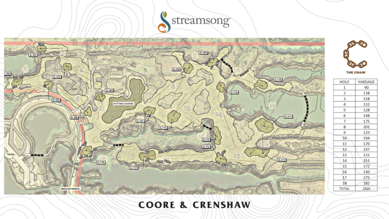 The Chain routing uses every nuance of a site encompassing roughly 100 acres. The 3,000-yard layout will be a walking course with holes ranging from 90 to nearly 300 yards. This new concept, with options of six-, 12- and 18-hole loops, does not require a full set of clubs, and will present guests with a quicker option than its larger and longer siblings.
