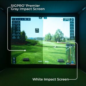The SIGPRO Premier Golf Simulator Impact Screen offers improved contrast, as gray screens absorb more ambient light than white or silver screens, which helps to maintain deeper blacks and prevents on-screen images from appearing washed out in brighter environments.