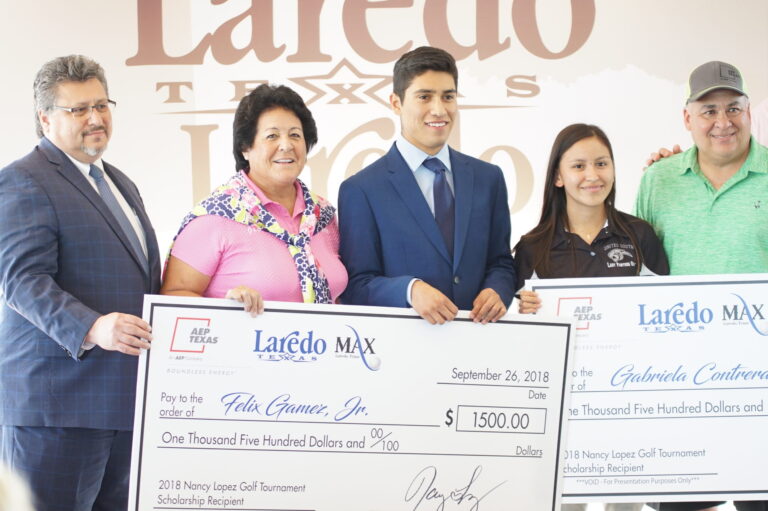 The recipients of the 2018 grants were Gabriela Contreras (United South High School golf team, United ISD) and Felix Gamez (Raymond and Tirza Martin High School golf team, Laredo ISD).  Both high school students embodied the scholarship criteria, expressed themselves in a written essay and were selected by a scholarship award committee.  Each was presented with a significant check by Lopez, the City of Laredo, Landscapes Unlimited and AEP Texas following the golf tournament.