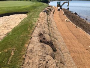 Mungeam and the club secured town permitting for revetments made of beach stone, dune grass and rolled cylinders of naturally fibrous matting. As part of the renovation, several of these coir logs were installed end to end along 8 and 14, then held in place with cables.